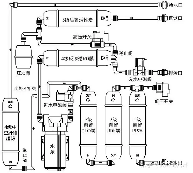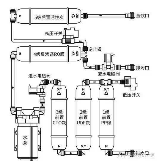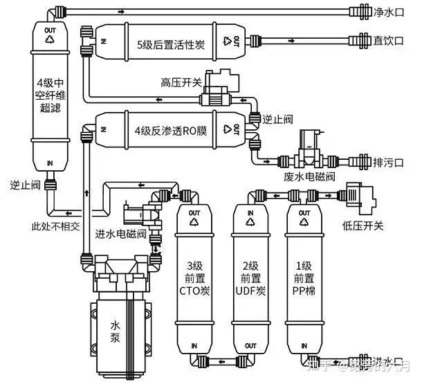 用卖家配的螺丝将泵安装到框架背板上,注意螺母要在泵这边 接下来新手可能需要仔细地对照着下面的图纸来接了,重点:减压阀、滤瓶、进水电磁阀、增压泵、止逆阀、废水阀、废水流量调节阀、后置炭滤芯,这些配件都是有方向的,要看清楚上面的箭头或者IN和OUT,可别装反了。当然了,RO膜也别装反,膜壳上的纯水和废水口也别弄反。前置三级滤芯因为用的是PP棉和CTO,安装时就不需要分方向。