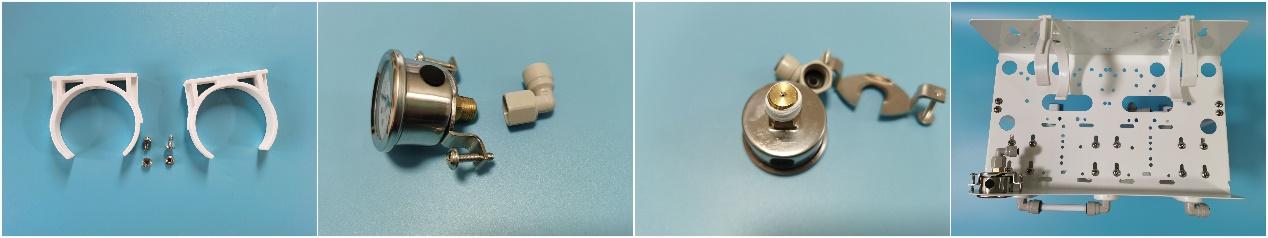 安装膜壳夹和水压表,中荷2分内牙接头虽然有垫片,但因为水压表螺纹杆不够长,还是需要缠上生料带才不会漏水的