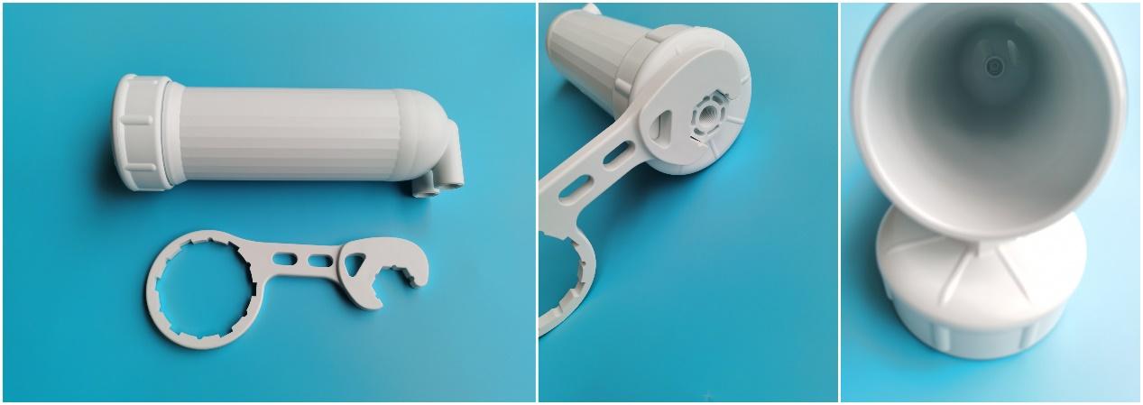 我之前选的是沛毅的滤瓶,因为太高了跟框架不匹配换成了CCK的,膜壳选的是溢泰的(现在难买到),这膜壳配套的扳手挺特别,看到膜壳内部中间的那个孔吗?那就是插RO膜集水杆的孔,也就是纯水出水口了,看看它跟膜壳外面哪个口是相通的就分得清纯水口和废水口了。