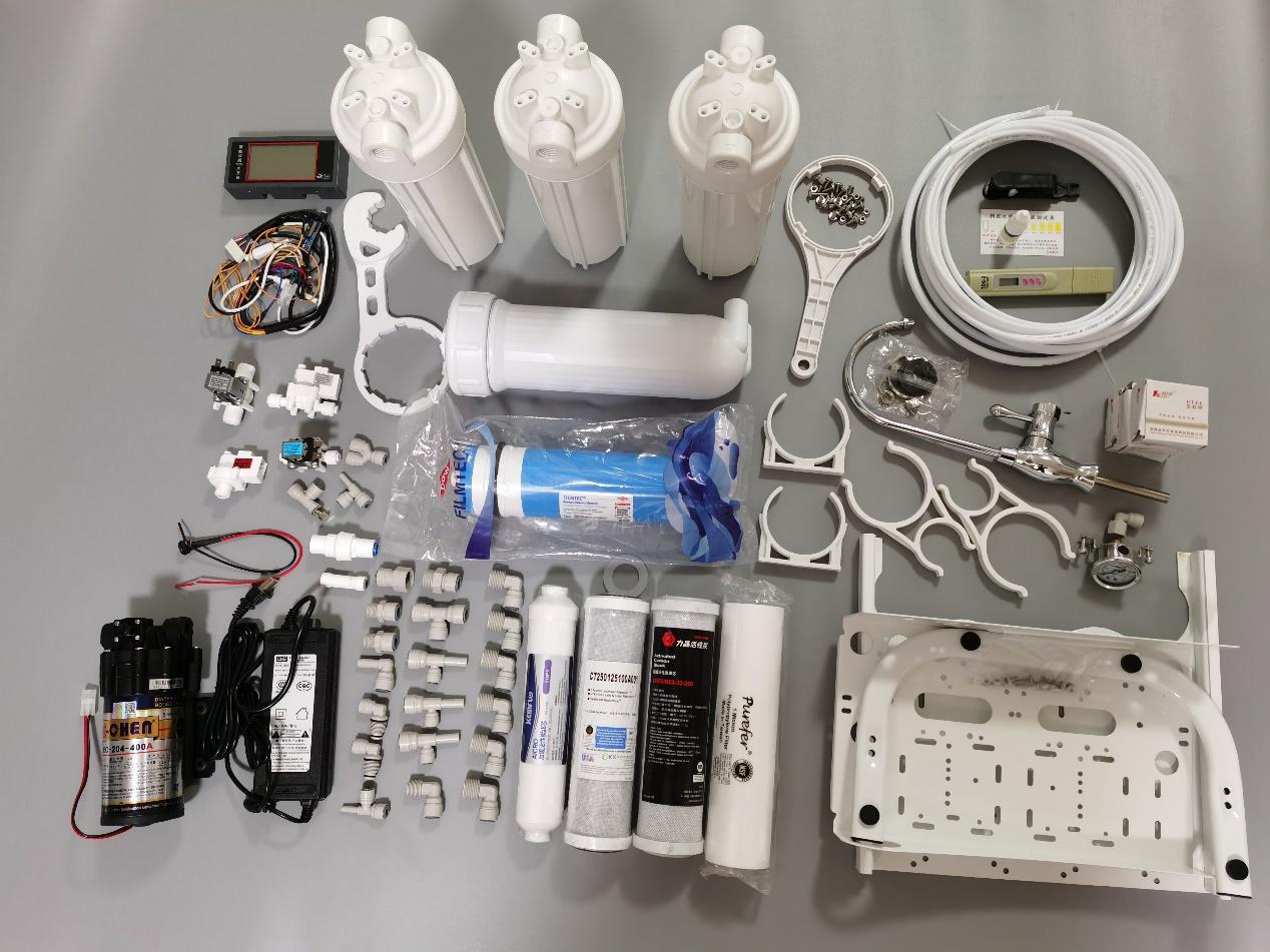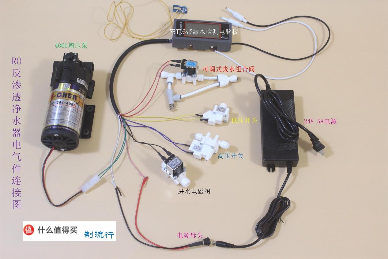 写到这里发现如果把各种电气件的照片都单独发上来会导致篇幅太长,只好把这张图提前放出来,下面还会再露脸。 增压泵:净水器隔膜泵的世界霸主是aquatec和shurflo,但现在很少有净水器品牌使用了,估计他们在家用净水器行业会没落,价格战打起来了谁会用那么贵的东西,但是他们在其它行业还是很牛逼,他们垄断了一些别的品牌无法跨越的水泵专利技术。shurflo的我没接触过,aquatec的试过一个非原装进口的,比较失望。本次使用的是三角洲204型号的400G泵,204型号比205的贵,买的时候要注意别用204的价格买到205。三角洲前身是台湾一全,泵上面的E-Chen就是一全的意思。用陶氏500G的膜但是配这个400G的泵的原因一是这个泵也算能发挥出陶氏500G的最大流量了,二是500或600G的泵噪音会更大价格也更贵。 电脑板:我用的这个控制器的电路板是点球做的,这公司的产品质量好稳定性好不会像有些较差的板子那样容易出现莫名其妙的问题,因为组装步骤还需要提到这电脑板就在后面再细说。 进水电磁阀、废水电磁阀、高低压开关:这些都用了科博的。 电源:这次用的是冠宇达24V 5A的,跟电源配套的母头是卖家送的,一线品牌净水器的电源几乎被冠宇达垄断了,没多少选择。几年前问过电源行业的朋友推荐的是明纬,但它主要是工业用的,不涉足净水器,当然也可以选择合适的型号来用,只不过付出的精力和花费要比直接选择冠宇达多。 六、纯水龙头。这次选择的是有NSF认证的立宽龙头,市面上非常难找到有NSF认证的净水器龙头,立宽是罕见的除部分新款外全型号龙头都有NSF认证的品牌。作为净水器纯水最后接触的配件,龙头的质量关乎饮水的安全,差的铜龙头怕铅和其它重金属超标,不锈钢的龙头看似很安全,但其实一样暗藏风险。在这里墙裂建议不管用什么龙头每次用水前都把存在龙头内部的那一点水先放走,可能就多花一两秒时间而已。先声明一下,立宽龙头我经手过两个但都送人了,自己目前还在用着八十多块的不锈钢龙头,正在等待立宽价格便宜点的款式但不知什么时候能等到。