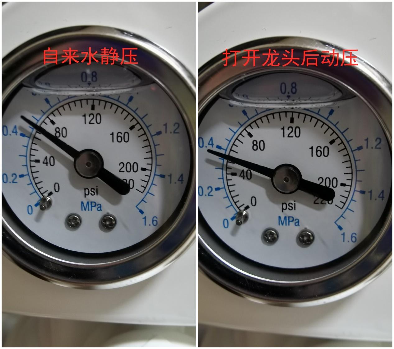 将膜前压力调到约7公斤,装满1升水耗时38.14秒,相当于1.57升/分钟。这里要说明一下,7公斤的数值是在第二天才测的,当时弄到太晚了就没一次性测完