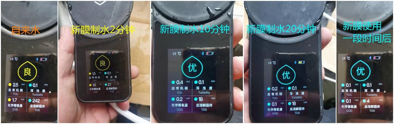 最后看一下北方水处理的老板用比TDS测试笔专业很多的多项水质检测仪测试的新RO膜冲洗时各项数值,也是仅供参考,各地水质不一样可能同样时间下的测试值都不一样,制水20分钟后TOC值还没有降到最低,脱盐率也还没有达到最高,脱盐率的变化跟我上面用TDS笔测试的结果相似。 好了,有泵的RO反渗透净水器的DIY教程到此就写完了