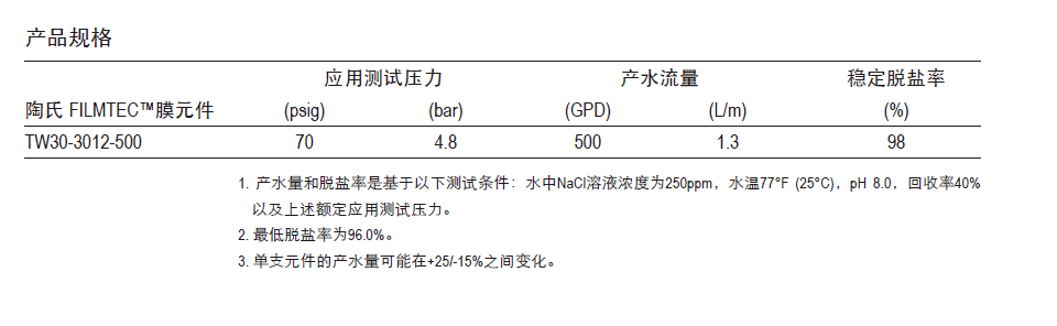 陶氏filmtec 3012-500G的官方参数二、其它滤芯。常见的净水器是5级结构,即有5级滤芯,RO膜在第4级,第1级一般用PP棉,235级一般都是活性炭。