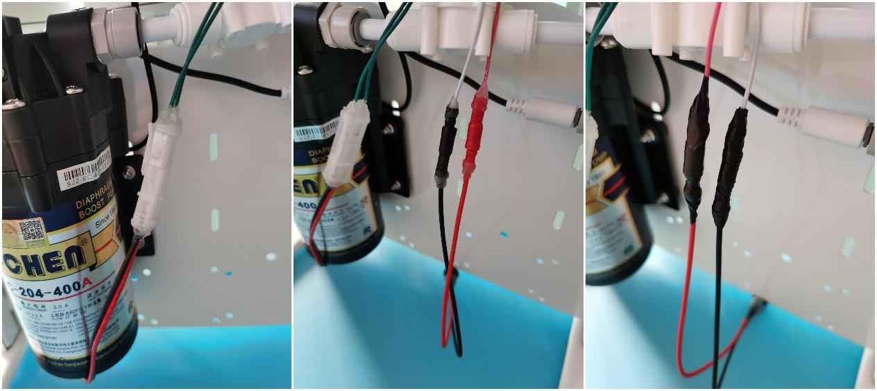 电源母头线跟电脑板的正负极线接好,打上胶,泵的接头也打上,反正胶条多的是,如果对接线端子那里还不放心,就包上绝缘胶布吧,有大小合适的热缩管也行,我买了热缩管,但感觉还不如直接包胶布就没用上。
