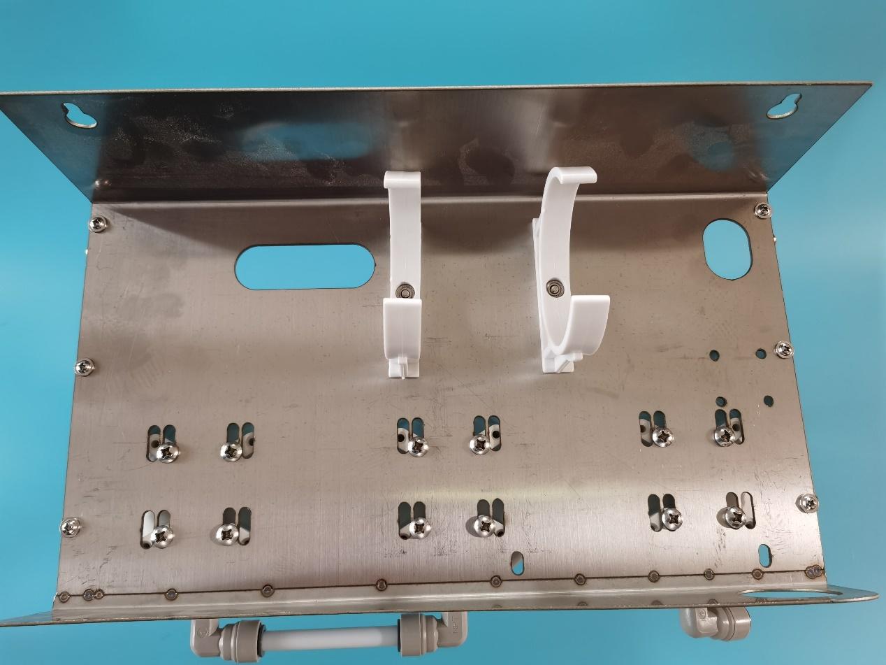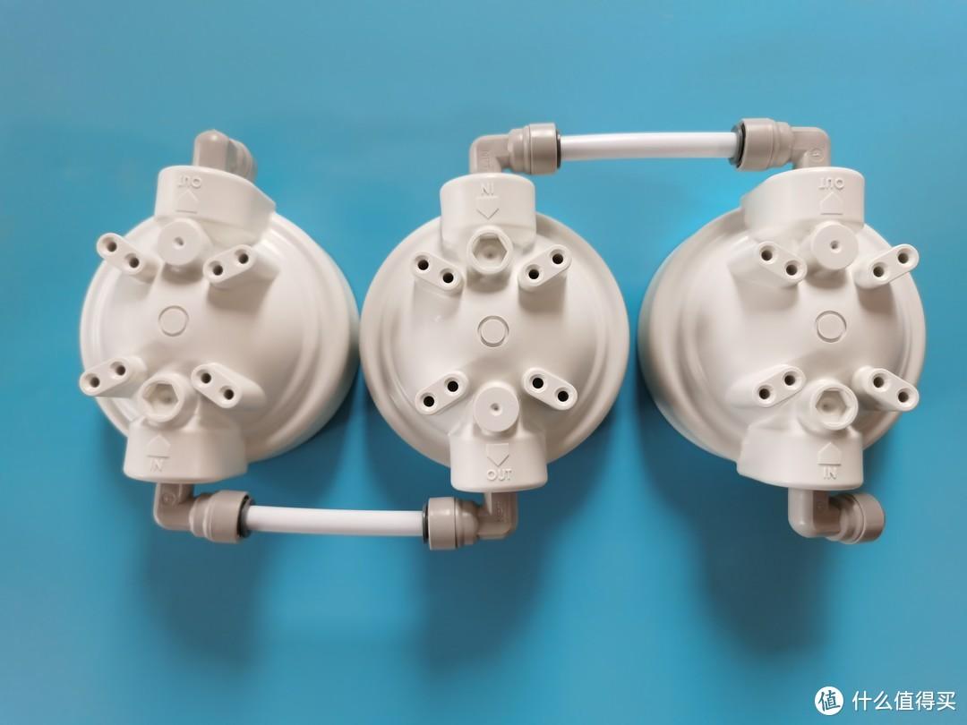 接头缠好之后都拧到滤瓶盖上,右边是第一级,注意IN和OUT,不要接反了。把管子插好之后将三个滤瓶盖用螺丝固定到框架上。