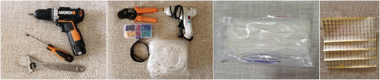 螺丝刀和扳手是必须要有的,螺丝刀手动或电动的都行,扳手不能太小,开口要比厨房龙头软管的螺母直径大。右边三张图的东西可有可没有,对DIY影响不大,分别是压线钳、接线端子、热熔胶枪、热缩管(这个我也没用上)、缠绕管、尼龙扎带、标签。
