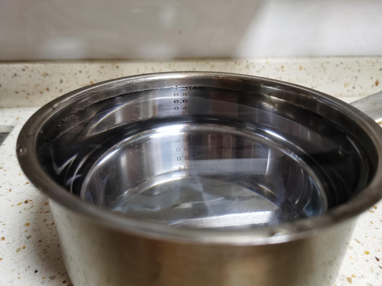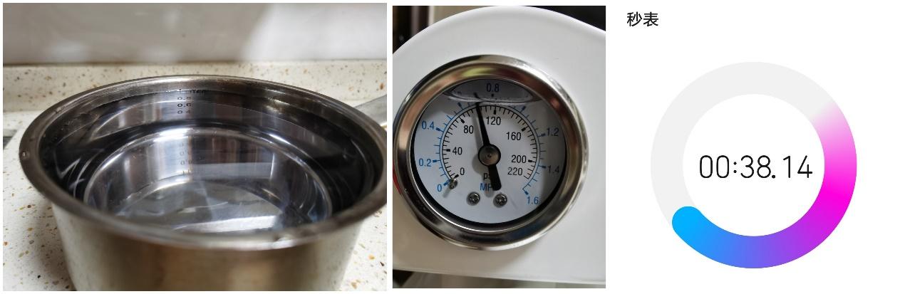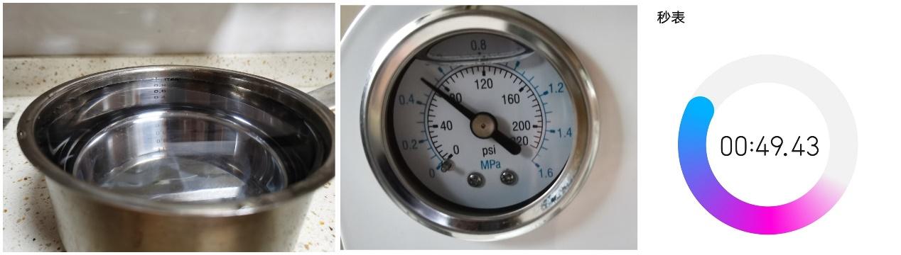 家里没有专业的量器,刚好这个煲带1升的刻度,就用它来测试出水速度,膜前压力约5公斤,装满1升水耗时49.43秒,相当于1.21升/分钟。