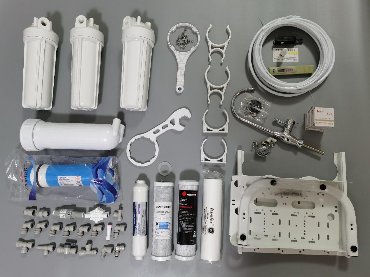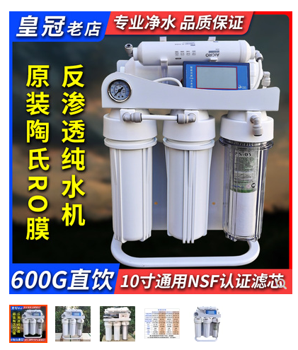 我国自来水标准较低,水质较差已经是一个老生常谈的问题了。水源污染、管道老化等原因,让自来水中的有害物质超标,使得几乎每家每户都标配净水器,自来水不煮开就不敢喝。 近几年,可以将自来水净化成可直接饮用的纯净水的RO反渗透净水器备受大家青睐,不过这种净水器的价格普遍较高,基本都要到千元左右,一些大品牌的甚至买到4.5千。 不过今天我想告诉大家的是,反渗透净水器也和电脑一样,不只有品牌机,还有组装机,甚至和能自己DIY,几百块钱就能达到几千元品牌机的效果。 反渗透净水器原理 反渗透净水器最核心的部件就是RO膜了(RO是英文ReverseOsmosis的缩写,中文意思是反渗透)。RO反渗透膜孔径小至纳米级,是头发丝的一百万分之一,一般肉眼无法看到,细菌、病毒是它的5000倍,因此,只有水分子及部分矿物离子能够通过,而源水中的无机盐、重金属离子、有机物、胶体、细菌、病毒等杂质无法通过RO膜。所有海水淡化的过程,以及太空废水回收处理均采用此方法,因此RO膜又称体外的高科技“人工肾脏”。 不过,一般情况下,液体的流动方向是从低浓度流向高浓度,而通过RO膜后的纯水,因为只含有水分子和少量矿物离子,浓度远比含有无机盐、重金属离子的源水低,要想让液体冲高浓度流向低浓度,也就是反渗透,就需要额外施加压力。所以,反渗透净水器一般都带有增加泵。 当然,反渗透净水器也和普通的净水器一样,会有多级滤芯,这些滤芯通常是用来先过滤掉一部分大分子杂质,保护RO膜,以此来延长RO膜的使用寿命,所以一般RO膜的更换周期普遍要比前级滤芯更长。 反渗透净水器的几个重要参数 通量 膜通量通俗来讲,就是指产水量,即在一定时间内通过反渗透膜的滤过的水量,也就是某段时间内的反渗透膜产水量。一般来说,通量越大,接满一定容量的水所需的时间越少。 现在市面上的反渗透净水器都用加仑(也就是G)这个单位来标明该净水器的产水量,例如50G表示该净水器一天的产水量为50加仑,一加仑为3.785升,所以该净水器一天可产生的纯净水约为189L。 一般来说,通量为100G左右的净水器,因为产水较慢,需要有一个储水瓶,用于存储净化后的水。要想即开既有水,不想要储水瓶的话,那么净水器的通量一般需要达到400G以上才能满足这个需求。 不过即使是400G通量,出水的速度也比不上采用储水瓶的净水器,至于储水瓶容易滋生细菌其实是无稽之谈,如果不是没地方放下储水瓶的话,小通量带储水瓶的反渗透净水器更具性价比。 除盐率 除盐率是衡量一款反渗透净水器是否优秀的重要参数。除盐率简单来说,就是该净水器(RO膜)能过滤掉多少溶解性固体、也就是阻止多少水中的溶解性固体透过RO膜。除盐率的计算公式可以简单的总结为 除盐率=(1-产水溶解性固体总量/进水溶解性固体总量) x 100% 即:除盐率=(1-产水TDS/进水TDS)×100% 膜元件的除盐率在其制造成形时就已确定,除盐率的高低取决于膜元件表面超薄除盐层的致密度,除盐层越致密除盐率越高,净化出来的水中,矿物离子越少,越接近于纯水,当然相应的,脱盐率越高产水量也会相应降低。一般来说,脱盐率97%以上为优秀,93%以上为合格。 废水比 我们在选购净水器的时候,经常会看到什么废水比1:1、2:1或3:1,这些究竟是什么意思呢?废水比1:1就指着产生一杯纯净水会产生一杯废水,2:1则表示产生2杯纯净水会产生一杯废水。 废水,其实就是净化过程中产生的含各种杂质的浓缩水。废水的产生是由于反渗透技术的工艺上的需求。原水里面的纯水透过RO膜,而其余盐分则保留在浓水端,如果不排废水,浓水端的盐分会越来越高,达到极限之后析出,堵在RO膜表面,是RO膜报废。 但是废水比并非越小越好,废水越少,RO主滤芯的工作压力越大,产水率和脱盐效果越差,RO膜使用寿命受到很大的影响。家用RO机,能达到国家规定GB34914-2017二级水效以上(1:1~2:1),就可以满足使用了。 寿命 RO膜的寿命一般在3年左右,合格的RO膜在三年内能够正常使用,产水量、脱盐率等性能能够达到标准。当然,RO膜的寿命并不是固定的,很大程度取决于所处地区自来水水质的硬度,硬度越高,RO膜的寿命越短,1到2年一换也是正常的。如果所处地区水质较好,RO膜的寿命也可能会大大超过三年。 为何几百元的组装净水器就能媲美大几千的品牌机 家用净水器的技术含量其实是特别低的,整个净水器稍微有一些技术含量的其实就只有其中的RO膜了,而整个净水器中成本最高的也就是RO膜还有增压泵了,其他的像PP棉滤芯和活性炭滤芯,其实都已经是工业制品了,价格都十分低廉。 我们以一个常见的5级过滤净水器为例。其中,净水器的5级分别为三个前置滤芯,一级PP棉用于吸附吸附1-5微米杂质、二级颗粒(UDF)碳和三级压缩(CTO)碳用于吸附氯气,保护反渗透膜,然后是反渗透净水器的核心RO膜、然后是改善出水口感的T33活性炭后置滤芯。 其中PP棉滤芯的价格十分便宜,10寸大小,重量为120克的PP棉滤芯(PP棉克数越高,代表可吸附的杂质越多,寿命越长),淘宝上的批发价格1-2块钱就能买到一支。 10寸的UDF颗粒活性炭滤芯淘宝价格一般在8-9元,批发价格还会更加便宜。 同样10寸大小的CTO压缩活性炭价格还有T33碳棒在淘宝上的售价也十分便宜。 接着是最核心的RO膜了,市面上的RO膜品牌,最有名的应该算美国的陶氏了,除此之外,像日本的东丽,韩国的世航还有国产的汇通,都算