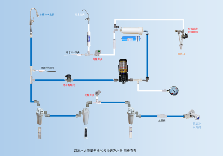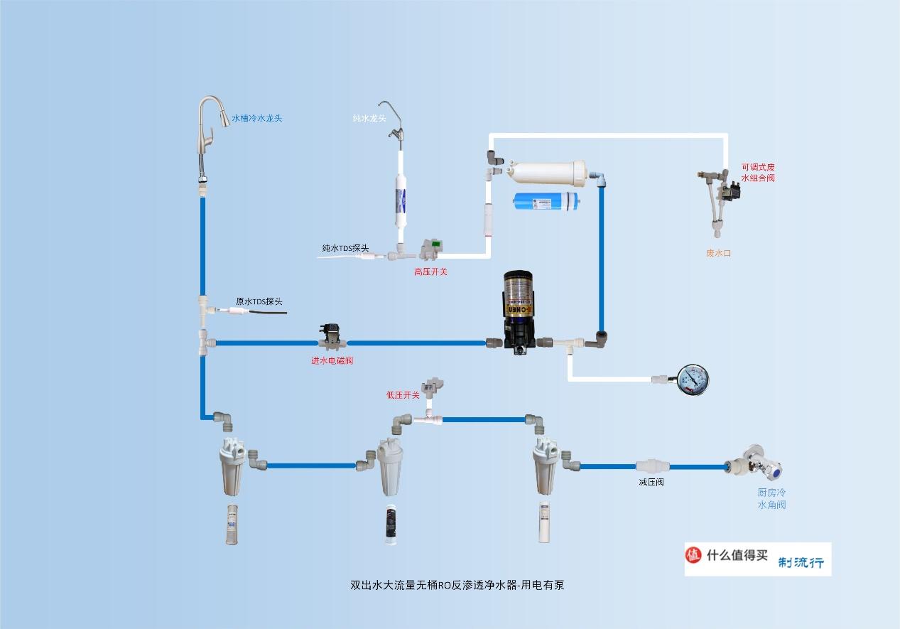 有泵的反渗透方案我依然选择搭配厨房冷水龙头做成双出水方案,不需要双出水只想要单出水的把冷水角阀那个4转3的中荷快接头换成一个三通,冷水龙头那里用一个球阀作为前三级滤芯的冲洗阀就行。严格按照这图来组装就不会导致莫名其妙的问题。电气件的连接图上面已经贴出来了,后面到了电气件接线的步骤时也会再看到。
